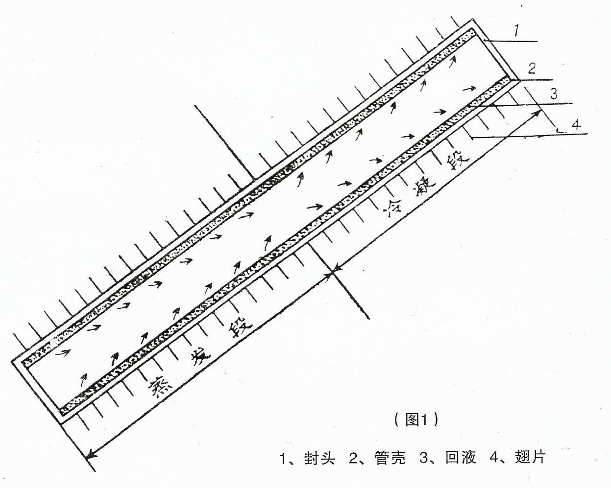 熱管就是將普通的金屬管子抽成真空,注入工作液體后密封的管子。通常是由管殼、管芯和工作介質(zhì)三部分組成。重力式熱管利用重力場回流,不設管芯。(圖1)